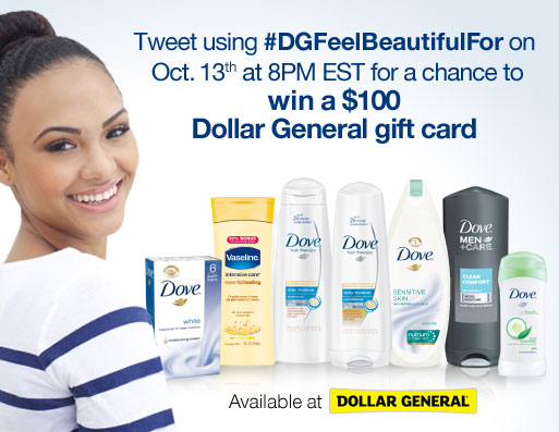 On October 13th, 2014 at 8 p.m. on Twitter there will be a super fun Twitter party. The hashtag for the part is #DGFeelBeautifulFor. Jump in the conversation by using the hashtag to tell us what what qualities and features you feel the most beautiful for and automatically be entered for a chance to win one of five, $100 Dollar General gift cards! Doesn’t that sound like fun? Yes it does!