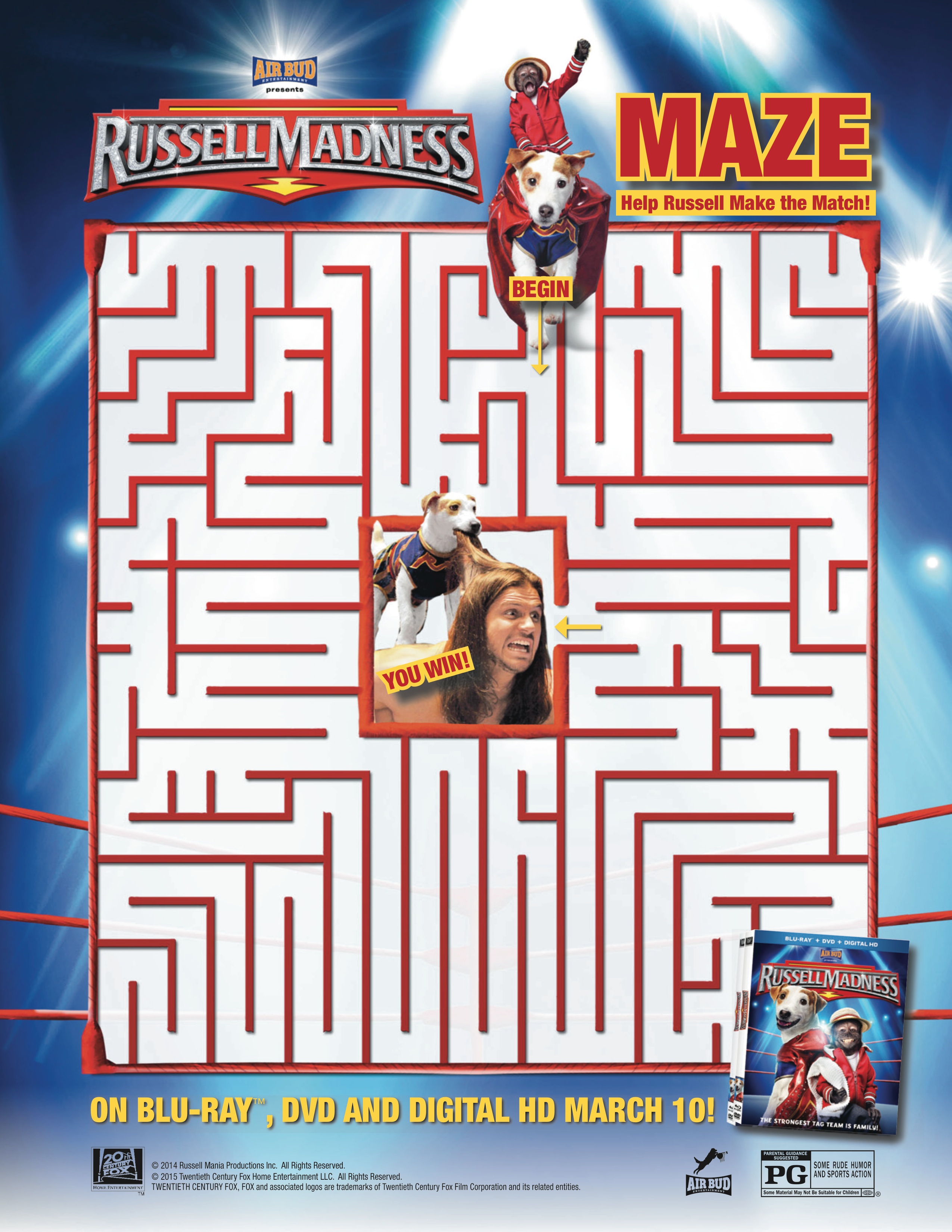 Get ready to “Russell!” Fandango, the nation’s leading moviegoer destination, and Air Bud Entertainment are proud to announce an all-new movie from the creators of the beloved ‘Air Bud’ and ‘Buddies’ franchise — RUSSELL MADNESS. Debuting in theatres February 21, 2015 as part of the Fandango Family Screening Series, and on home entertainment in Spring 2015 from Twentieth Century Fox Home Entertainment, the hilarious, all-new family adventure is the first feature film from newly-launched Air Bud Entertainment, the creative force behind the #1 live-action, direct-to-video movies in the family category. The exciting action-packed adventure introduces ‘Russell,’ an adorable TALKING Jack Russell Terrier who accidentally becomes a professional wrestling superstar, on the way to discovering the true power…of family. The official RUSSELL MADNESS movie trailer launched today and can be viewed at: http://youtu.be/Ur6XdaGNlTY.