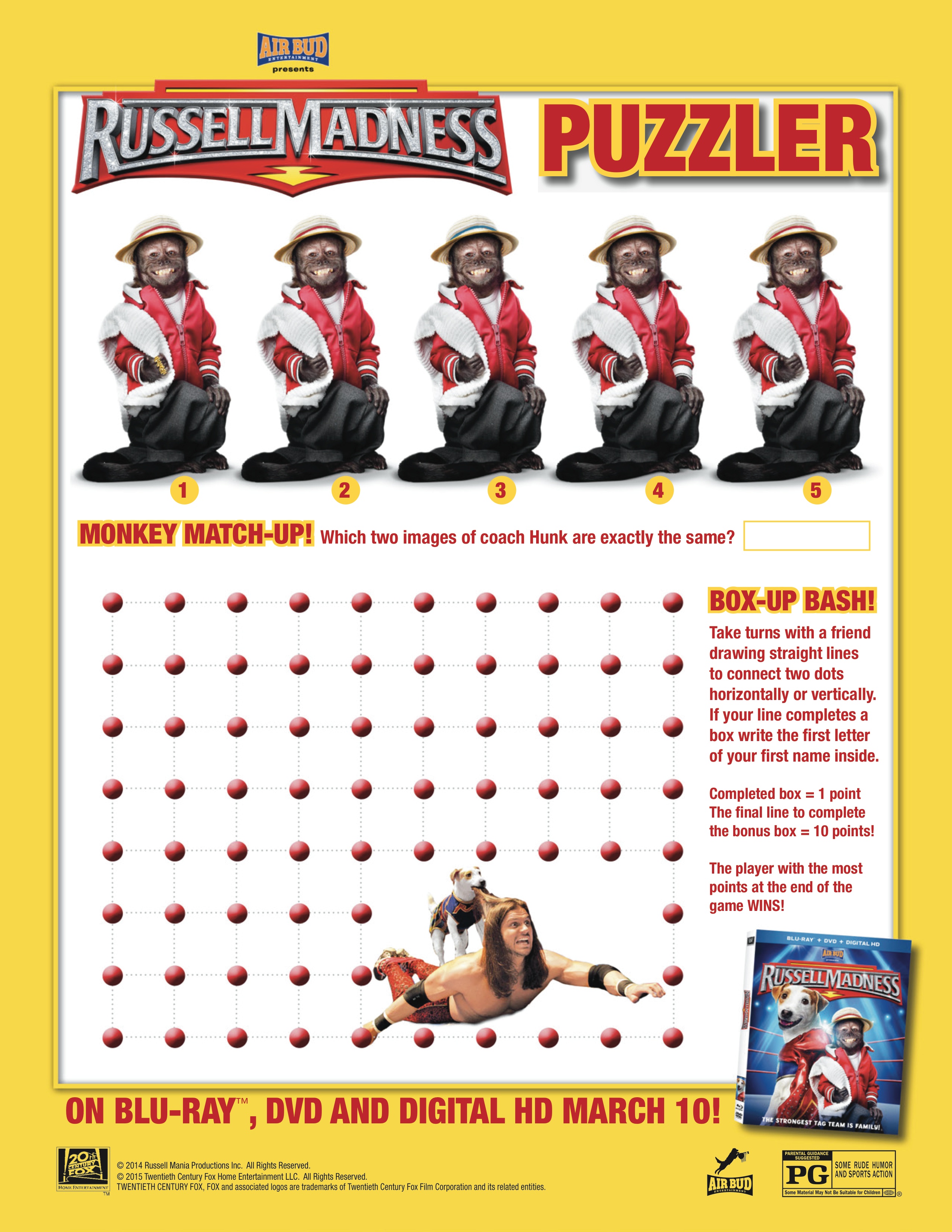 Synopsis: RUSSELL MADNESS tells the story of Russell, an undersized but big-hearted terrier who dreams of having a family of his own. After running away from his pet store, Russell gets taken in by The Ferraros, a family desperate to revive their grandfather’s pro wrestling arena. That’s when they discover their new pet pooch has incredible wrestling skills. With help from his coach, Hunk, a savvy and hilarious monkey, Russell rockets to the top of the pro wrestling world and becomes a famous sports superstar. But when a dishonest promoter double-crosses the Ferraros, Russell will face his biggest challenge and discover that the strongest tag team is family. RUSSELL MADNESS is rated ‘PG’ by the Motion Picture Association of America (MPAA).