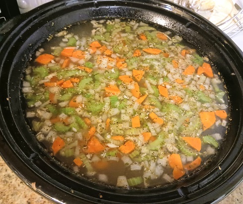 Once it’s done cooking I like to strain it to get all of the bones, gristle and skin out of the broth. Pour the broth back into the slow cooker. I then add sliced carrots, chopped onions and chopped celery. The amounts will depend on how much turkey meat and broth that you have. Approximate amounts are as follows: