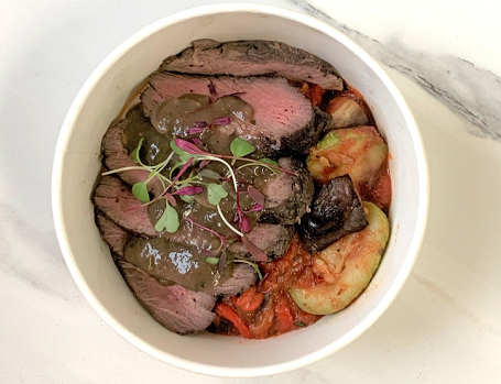 It is pan-seared and finished with a reduction sauce that is made without gluten-thickening agents. Additionally, ratatouille brings vibrant color to the plate, as well as nutrition, with slow-cooked eggplants, zucchini, bell peppers, and tomatoes.