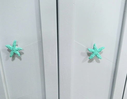The door knobs or door pulls were a plain silver-tone knob. Not very attractive. Just something standard I guess. Anyway, I went over to Amazon and purchased two cast-iron cabinet knobs in the shape of a starfish. They were white-washed. We put them on the doors but they totally blended in with the light gray color of the door. Ugh. I didn’t like that at all. Yes…they’re cabinet knobs but work great for these type’s of closet doors.