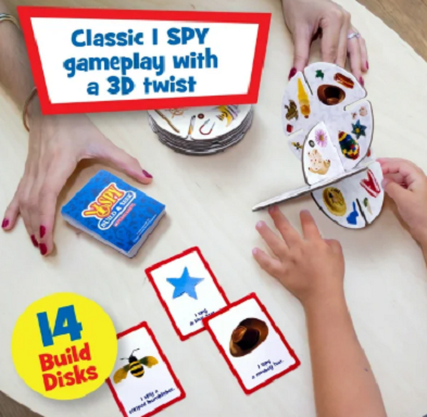 Once the board is built, players take turns drawing a challenge card featuring an I SPY clue. Everyone then plays at once by frantically searching the structure of I SPY discs. During the search process, only the player who revealed the clue is allowed to turn or flip the entire structure once during the search process. This twist may provide a fresh look for some, but confuse others, as everyone looks for the answer.
