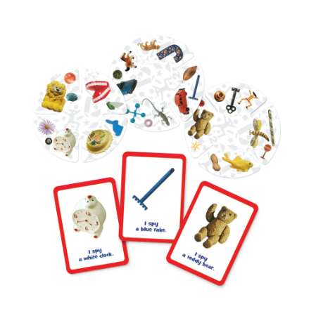 Objective: Build the I Spy Tower, Flip a Seek Card and race to be the first to find 5 hidden objects. There are limitless ways to assemble the disks, making the game board different every time.