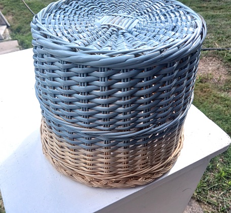 I decided to use spray paint to change the color of the basket. It’s a bluish gray color…perfect for a coastal themed home. In my photograph…the color looks a lot darker than it really is. I sprayed 2 light coats of paint on the outside and then once it was dry…painted the inside. You always want to use spray paint outside on a decent weather day. Also, stand back when you’re spraying to avoid drips and globs. Let paint thoroughly dry in between coats.