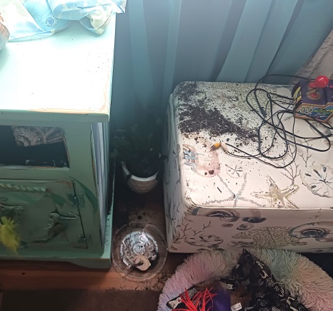 Anyway, last month we were out doing some things and were gone for several hours. Once we got home we were surprised to find a big mess that Romeo had made while we were away. He knocked over several of my houseplants and flameless candles in our dining room. There was dirt and plants every where! This was the first time that he had ever made a mess like this!!!