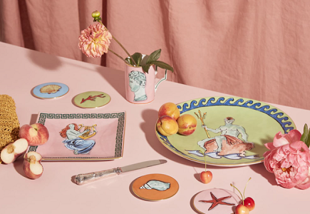 Piero Fornasetti’s studio focuses on small-batch tableware collections, all handmade in Milan and released in limited editions. The brand’s philosophy is to transform utilitarian objects into poetic expressions, making each plate feel almost like an art piece. The brand’s decor is characterized by surreal art iconography, a black-and-white color scheme, gold accents, and a surreal form of neoclassicism that blends antique forms with modern graphics and absurdity. Perhaps most iconic is the brand’s famed Tema e Variazioni series — an artistic homage to opera singer Lina Cavalieri, whose enigmatic face appears in hundreds of surreal, elegant interpretations across plates, vases, and trays, becoming the very symbol of Fornasetti.