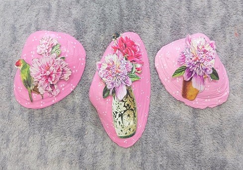 Base coat all of the seashells with acrylic craft paint in a color that will coordinate with the 3-D sticker embellishments that you selected. I went with a pink color. I applied two coats of paint to each seashell so that I got the coverage that I needed. Let dry for 1-2 hours or until the paint is no longer tacky.